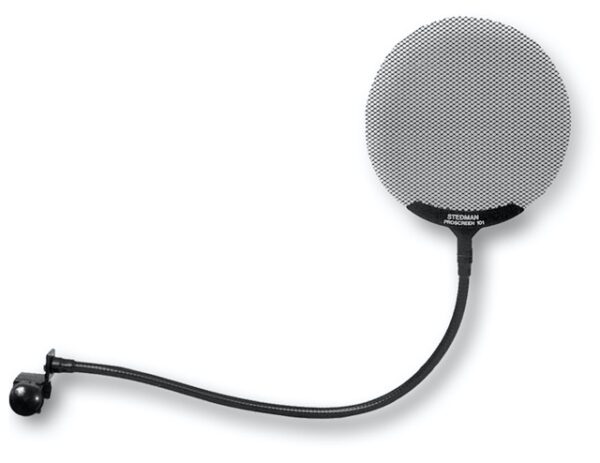 The Stedman PS101 Proscreen is a popular pop filter design that has a 4.6 inch diameter metal screen used to eliminate bursts on vocal recordings. The PS101 Proscreen has a 13 inch long heavy duty adjustable gooseneck. The Proscreen pop filter is far more effective than fabric filters. Instead of simply diffusing bursts, the Proscreen redirects airflow downward away from the microphone capsule. Even with close vocal work, the Proscreen pop filter will not allow popping “P’s” or “B’s” to reach the microphone. The large openings in the metal screen allow vocal sound to pass through to the microphone unobstructed and uncolored, preserving critical recorded detail.